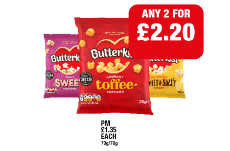Butterkist Popcorn Toffee, Sweet, Sweet & Salty - Any 2 for £2.20 at Family Shopper
