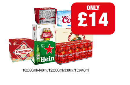 Budweiser, Coors, Stella Artois, Moretti, Cruzcampo, Heineken, Estrella - Now Only £14 at Family Shopper