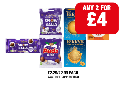 Cadbury Mini Snow Balls, Bar, Puds Minis, Terry's Chocolate Orange, Caramel, Toffee Crunch - Any 2 for £4 at Family Shopper
