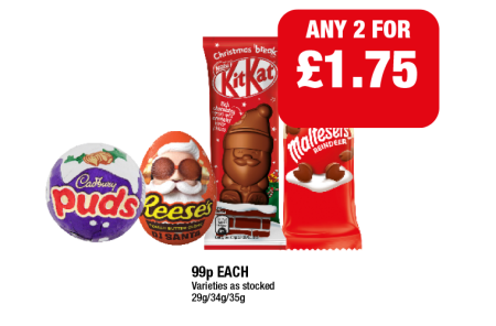 Cadbury Puds, Reese's DJ Santa, KitKat Santa, Maltesers Reindeer - Any 2 for £1.75 at Family Shopper