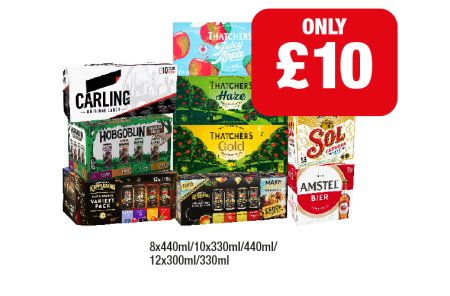 Carling, Hobgoblin Variety, Kopparberg Variety, Strawberry, Thatchers Juicy Apple, Haze, Gold, Coors, Sol Cerveza, Amstel - Now Only £10 at Family Shopper