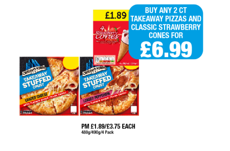 Chicago Town Pizza Takeaway Stuffed Crust Loaded Cheese, Pepperoni, Strawberry Cones - Buy Any 2 Chicago Town Pizas And Classic Strawberry Cones for £6.99 at Family Shopper