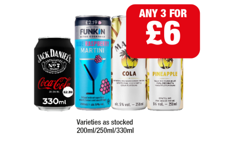 Dead Man's Fingers, Jack Daniels Coca Cola, Funkin Blue Raspberry Martini, Captain Morgan Pepsi Max - Any 3 for £6 at Family Shopper