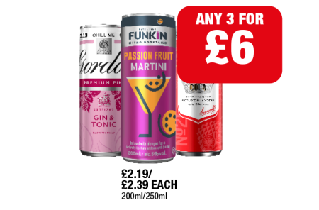 Gordon's Pink Gin & Tonic, Funkin Martini, Smirnoff Vodka Cola - Any 3 for £6 at Family Shopper