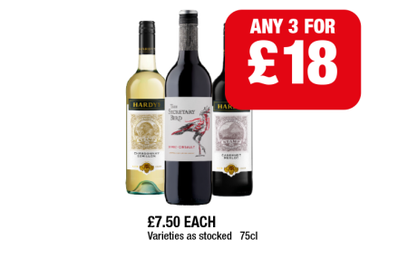 Hardy's Chardonnay, Cabernet Merlot, The Secretary Bird - Any 3 for £18 at Family Shopper