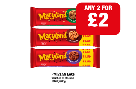 Maryland Choc & Hazelnut, Choc Chip, Double Choc - Any 2 for £2 at Family Shopper