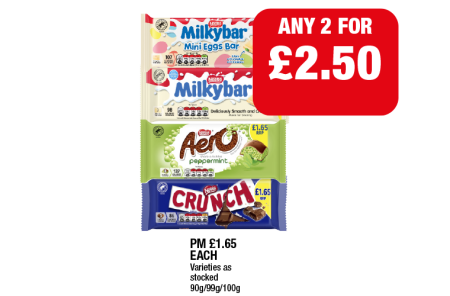 Milkybar, Mini Eggs Bar, Aero Peppermint, Crunch - Any 2 for £2.50 at Family Shopper