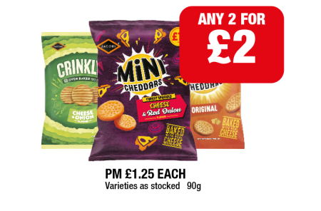 Mini Cheddars Original, Cheese & Red Onion, Crinkly Cheese & Onion - Any 2 for £2 at Family Shopper