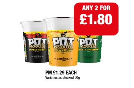 Pot Noodle Bombay Bad Boy, Original Curry, Chicken & Mushroom - Any 2 for £1.80 at Family Shopper