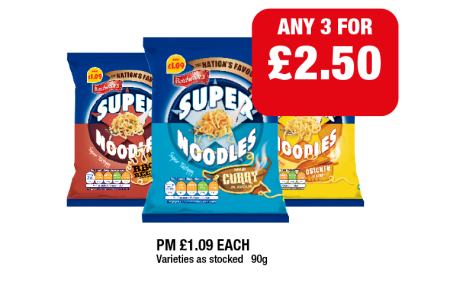 Super Noodles BBQ, Mild Curry, Chicken - Any 2 for £2.50 at Family Shopper