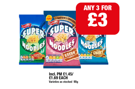 Super Noodles Chicken & Mushroom, Bacon, Curry - Any 3 for £3 at Family Shopper